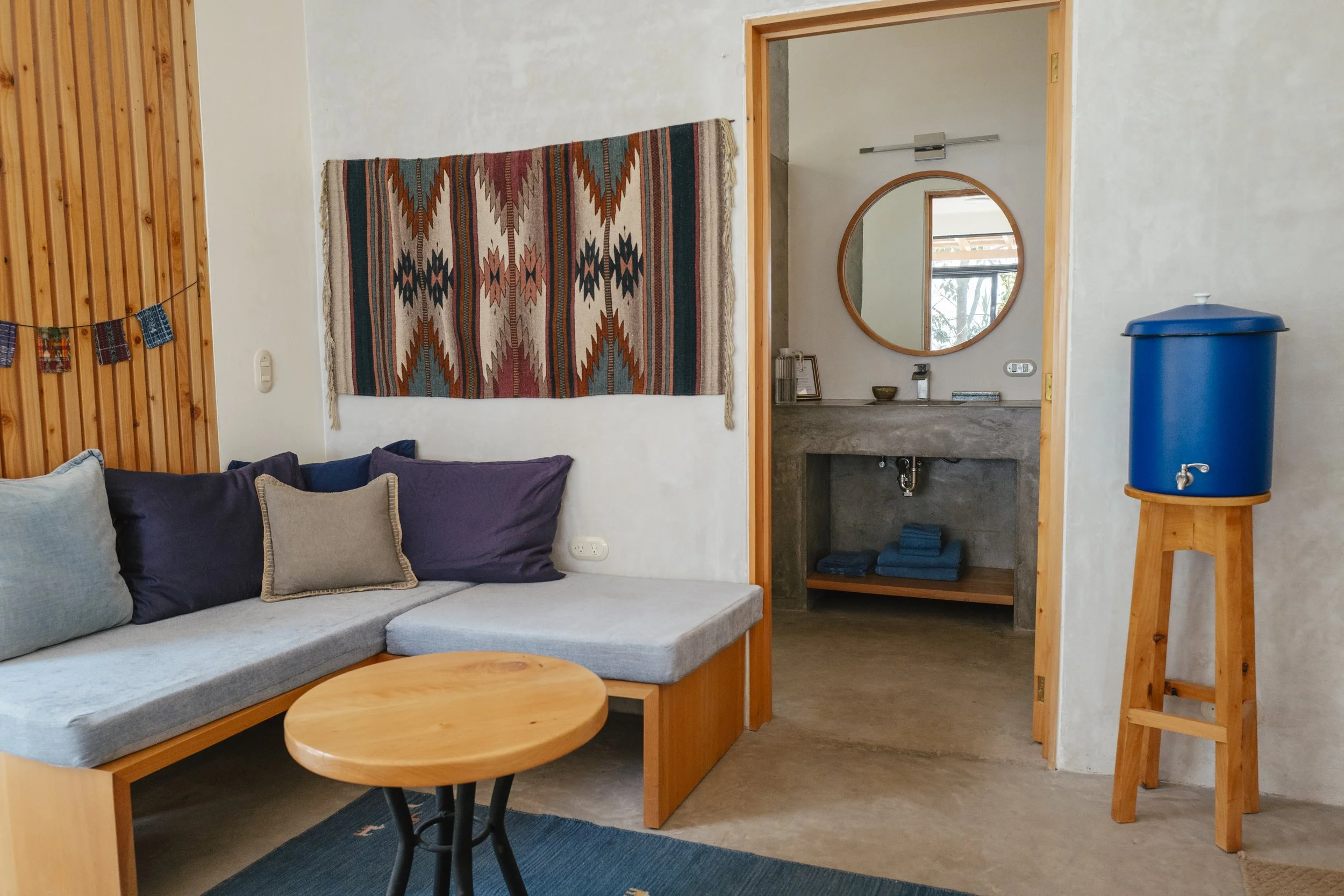 Retreat to your own serene sanctuary with a private room featuring a queen or king bed and your own bathroom. Each room is thoughtfully appointed with warm décor and offers a cozy, restful place to unwind after the day’s movement, reflection, or exploration. Many private rooms include a patio or balcony with sweeping views of Lake Atitlán and the surrounding volcanoes — the perfect backdrop for morning coffee or quiet sunset moments.