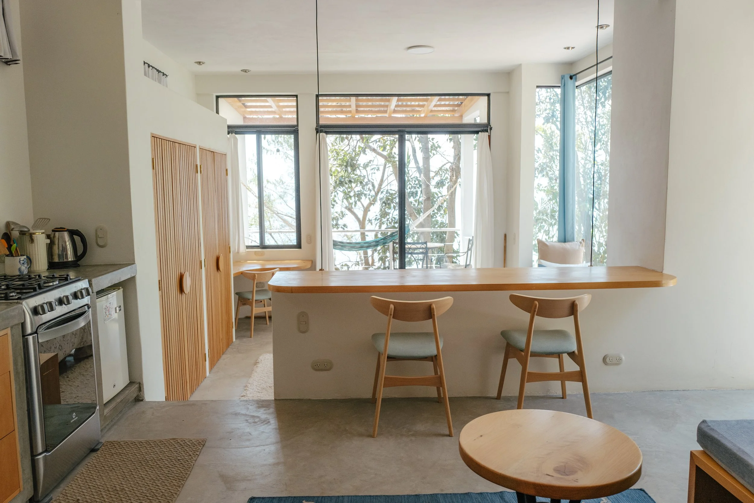 For those who enjoy companionship or are traveling with a friend, our shared room options offer two comfortable beds (One Queen + One Twin) and your own private bathroom. Each shared space is designed with thoughtful touches and warm finishes, creating a welcoming environment that still feels personal and restful. Like the private rooms, many shared accommodations open to patios or terraces where you can enjoy views of the lake and volcanoes, or linger with new friends after dinner.